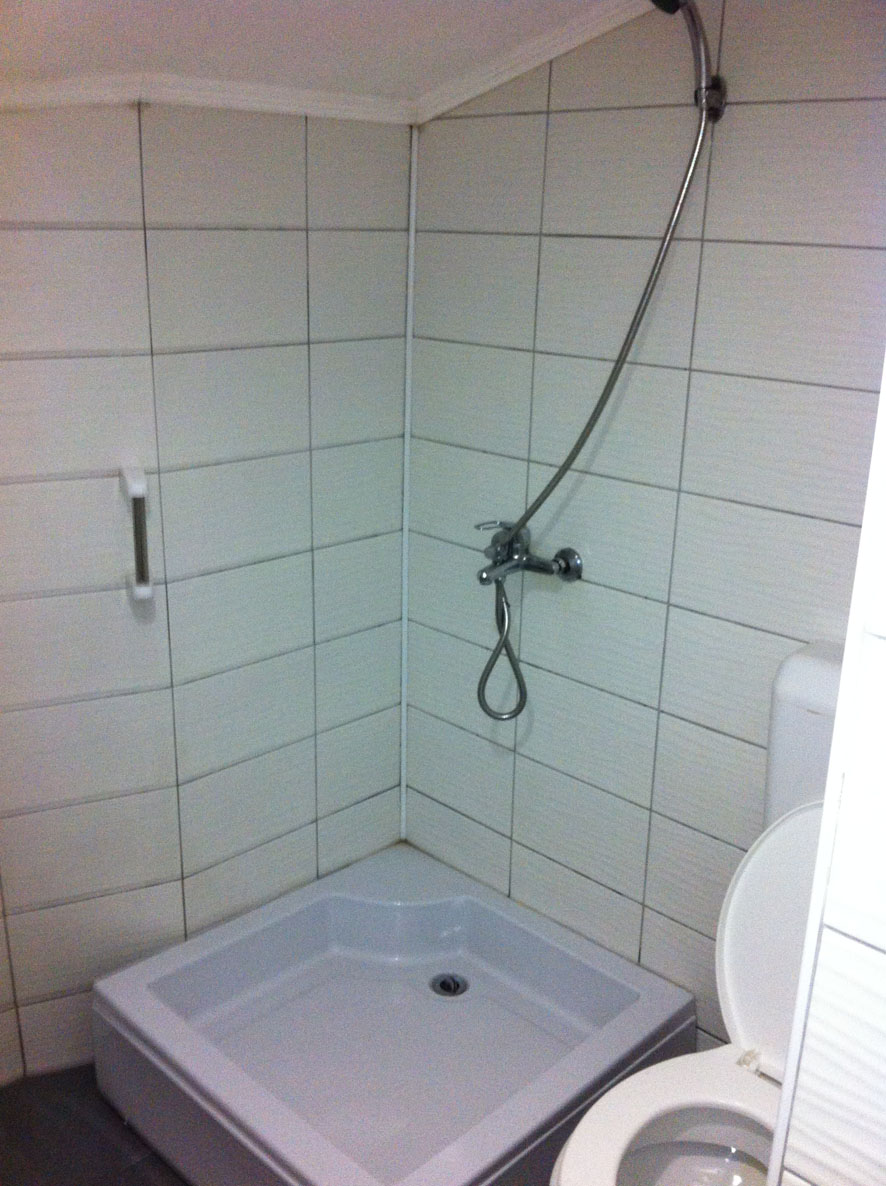 Derfor blir det ogå endel turer i dusjen på hotellet. Der har nok interiørdesigneren hatt en vanskelig jobb. Det virker som om han eller hun har gitt opp allerede i utgangspunktet og resultatet er blitt et «dusjpodium»: Det er sannsynligvis bunnen av noe som burde vært et dusjkabinett, men det er verken vegger eller forheng, og det er så lavt under taket at det er nødvendig å gå i hockey for å få det til. Det betyr at absolutt alt blir vått; det er kort og godt umulig å samle strålen fra dusjhodet. Det er viktig å redde unna toalettrullen – fjerner du den ikke har du en våt klump kreppapir etter seansen.